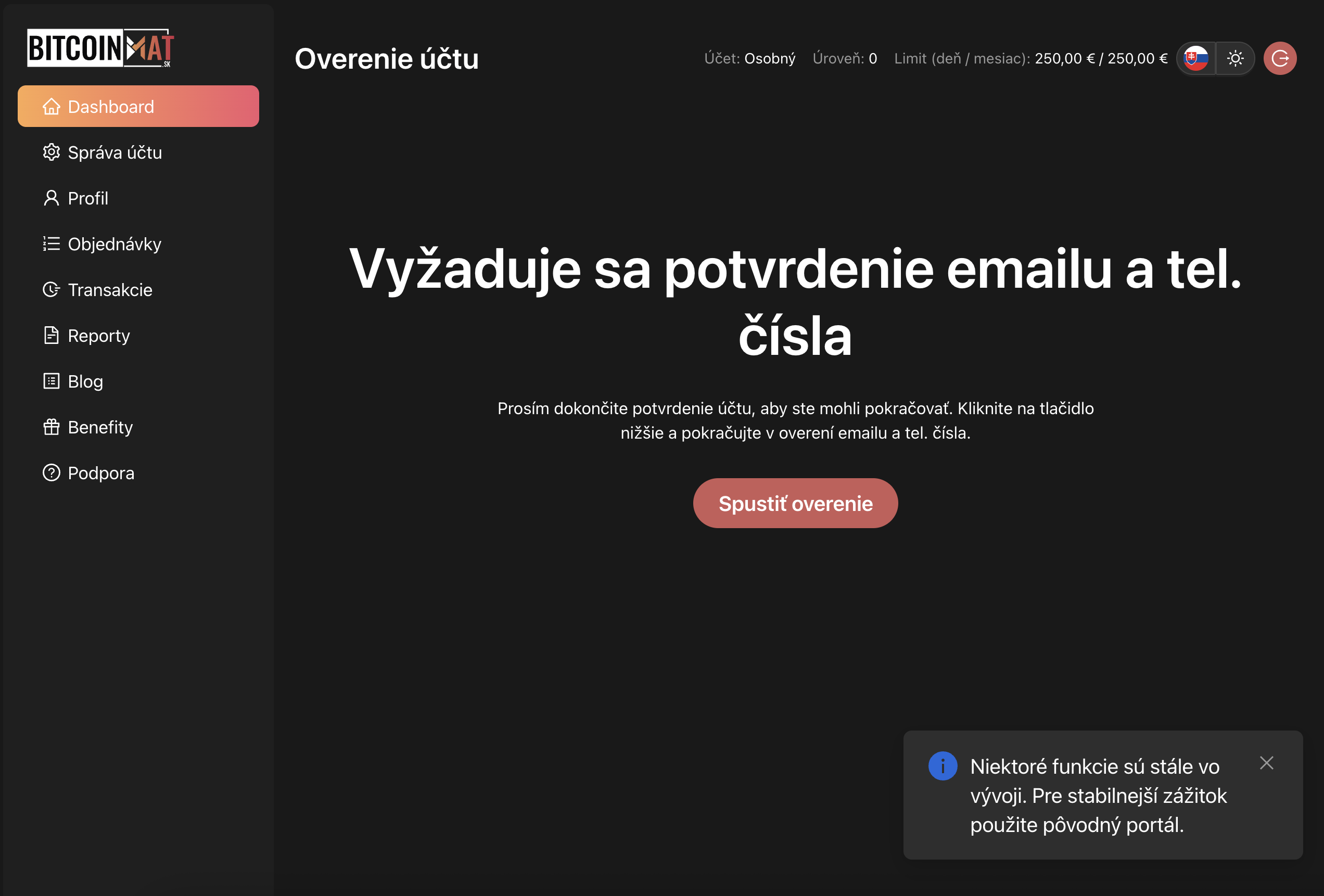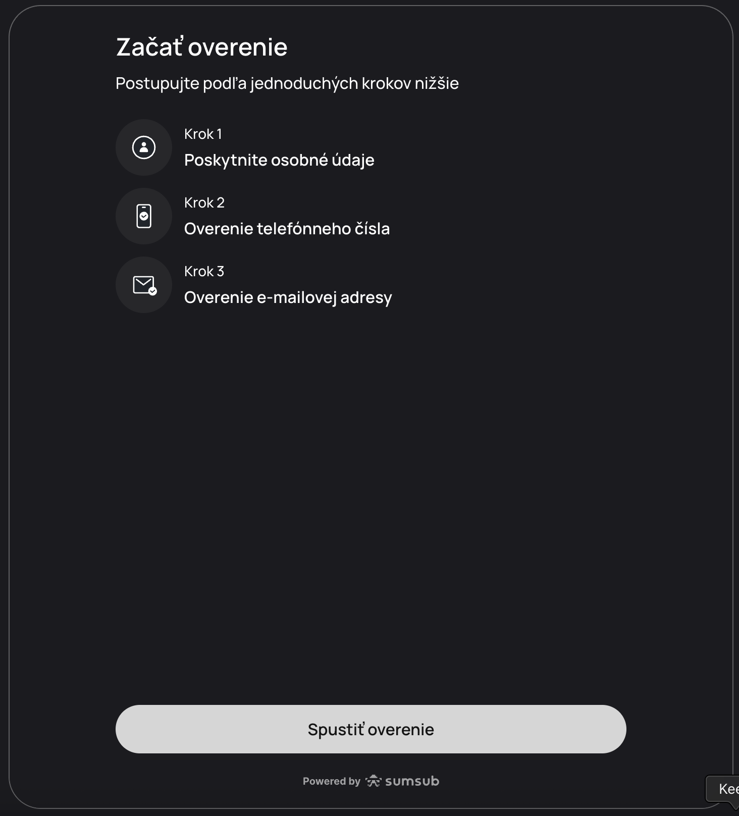 Po zadaní základných údajov a zaškrtnutím tlačidla Súhlasím s VOP a GDPR budete presmerovaný do Dashboardu. Ďalším krokom je overenie účtu na Level 0, tzn. emailu a telefónneho čísla, ktoré zabezpečuje tretia strana SumSub a vykoná sa stlačením tlačidla Spustiť overenie.