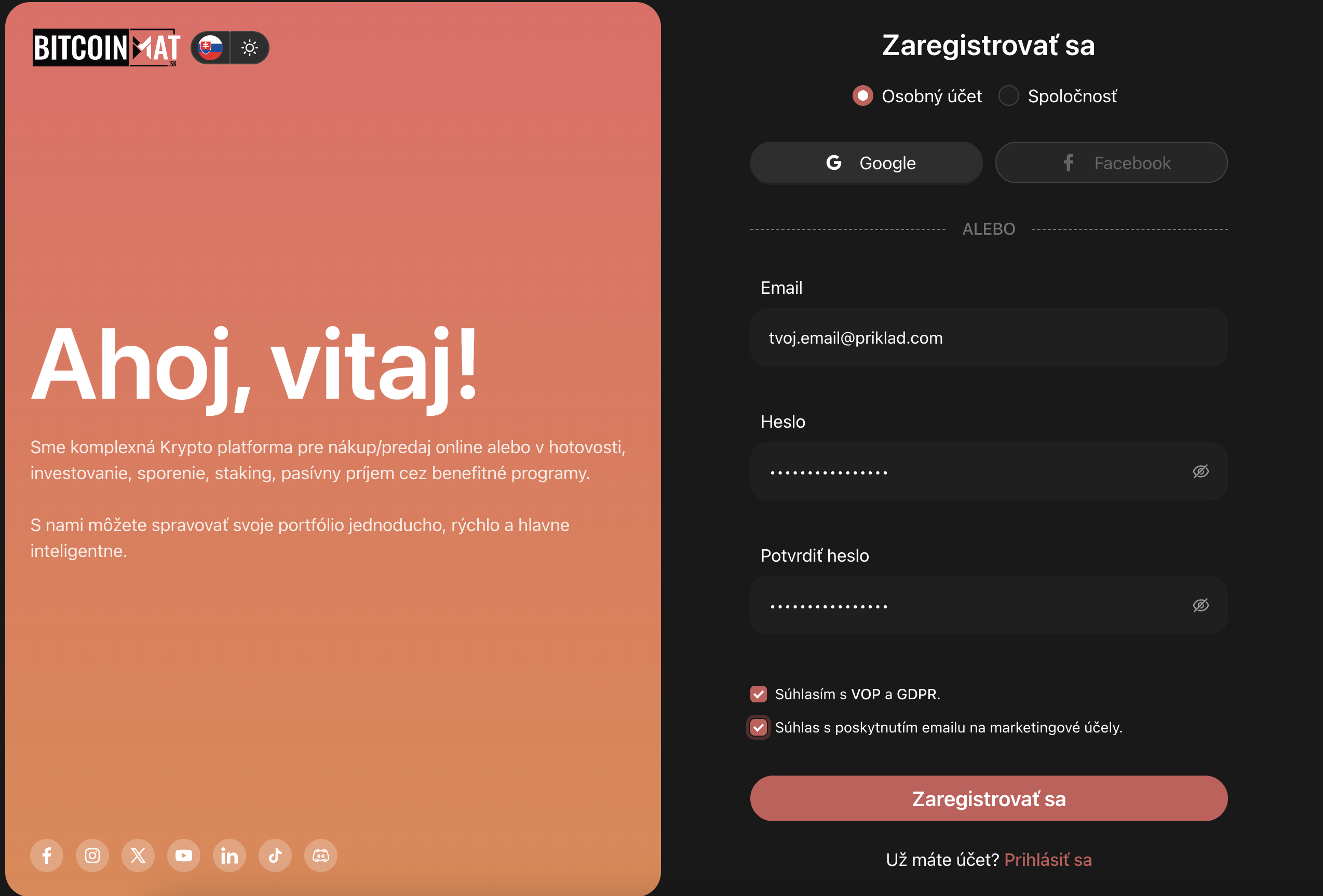 Predtým než sa pustíme do Registrácie, je potrebné zvoliť si či sa jedná o Osobný alebo Firemný účet. Ak sa jedná o Osobný, Registráciu je možné vykonať tromi spôsobmi: