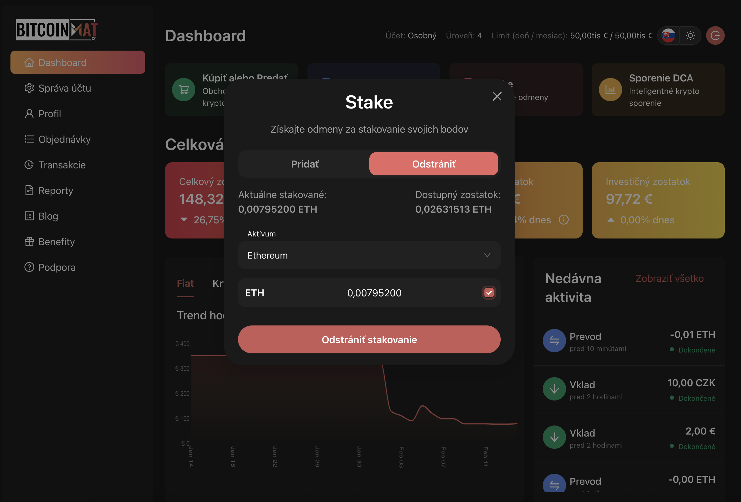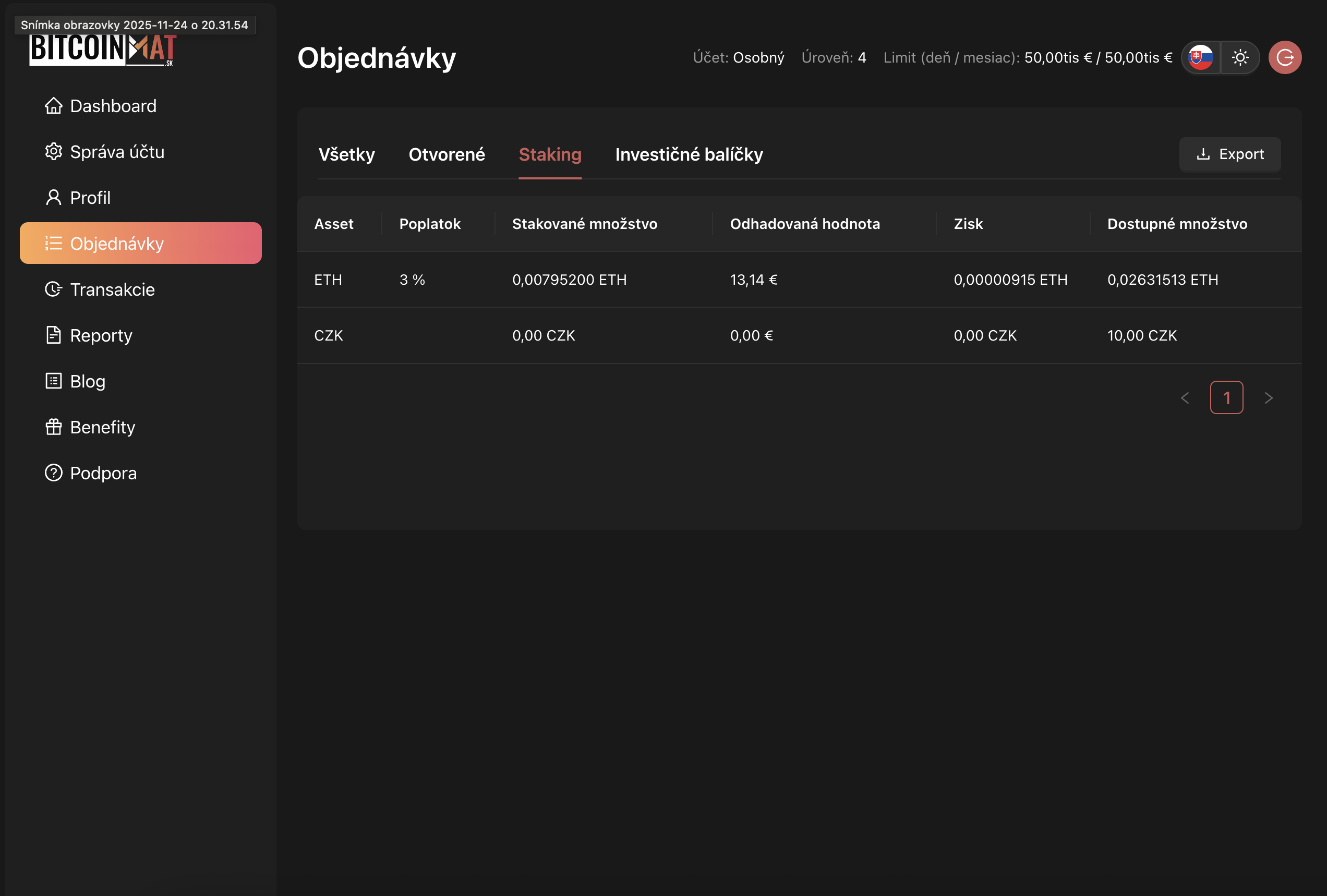 V Dasboarde v sekcii Objednávky, záložke Staking môžeme vidieť aktuálne zastakované kryptomeny v takom poradí ako sme zadali žiadosti.
