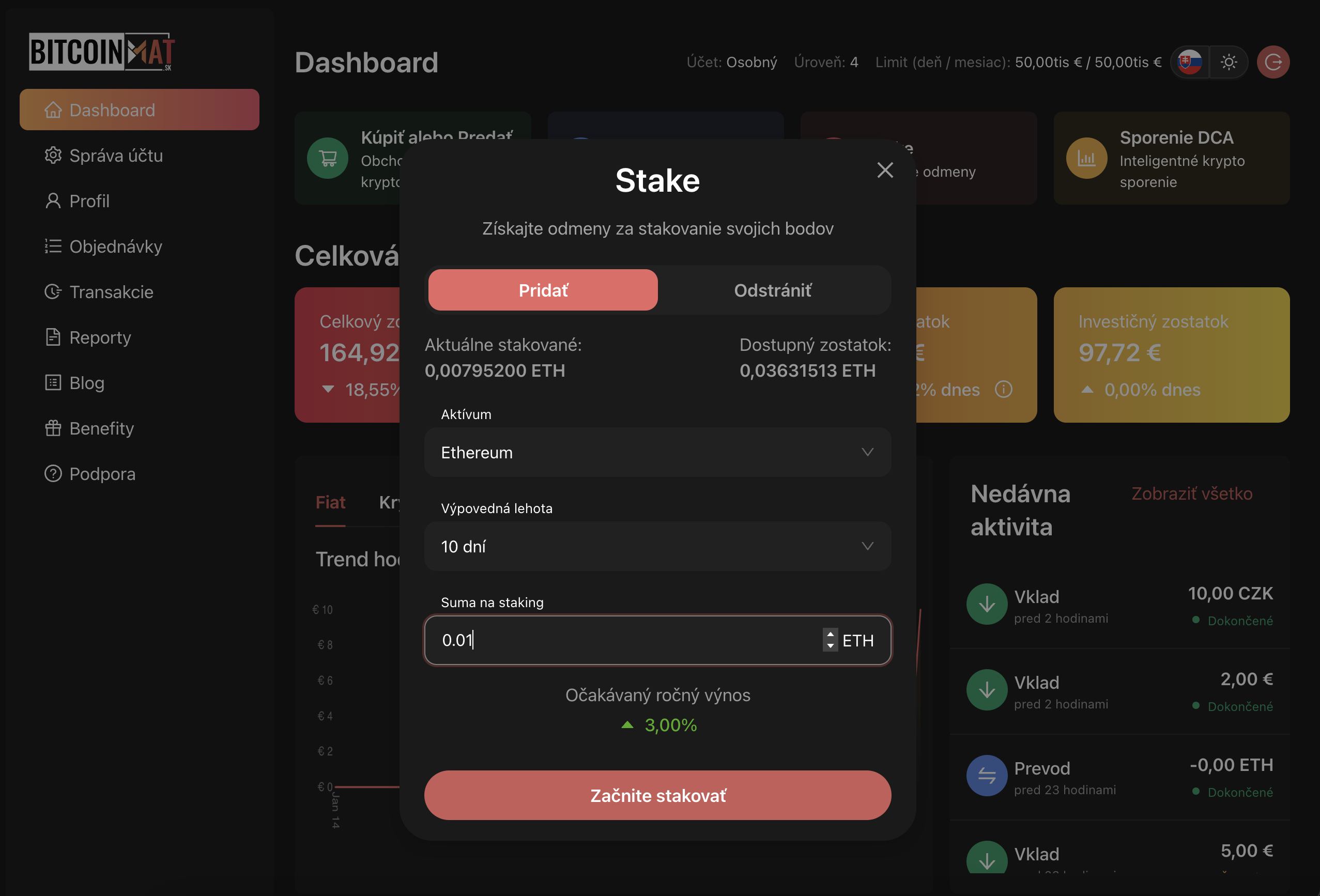 Pre možnosť sporenia (stakovania) kryptomeny je v prvom rade potrebné mať požadovanú kryptomenu zakúpenú na vašej internej peňaženke, čo vykonáte podľa postupu Ako nakúpiť bitcoin jednoducho? a vo voľbe si zvolíte Interná peňaženka. Keď budete mať požadovanú kryptomenu zakúpenú na internej peňaženke, môžete začať sporiť.